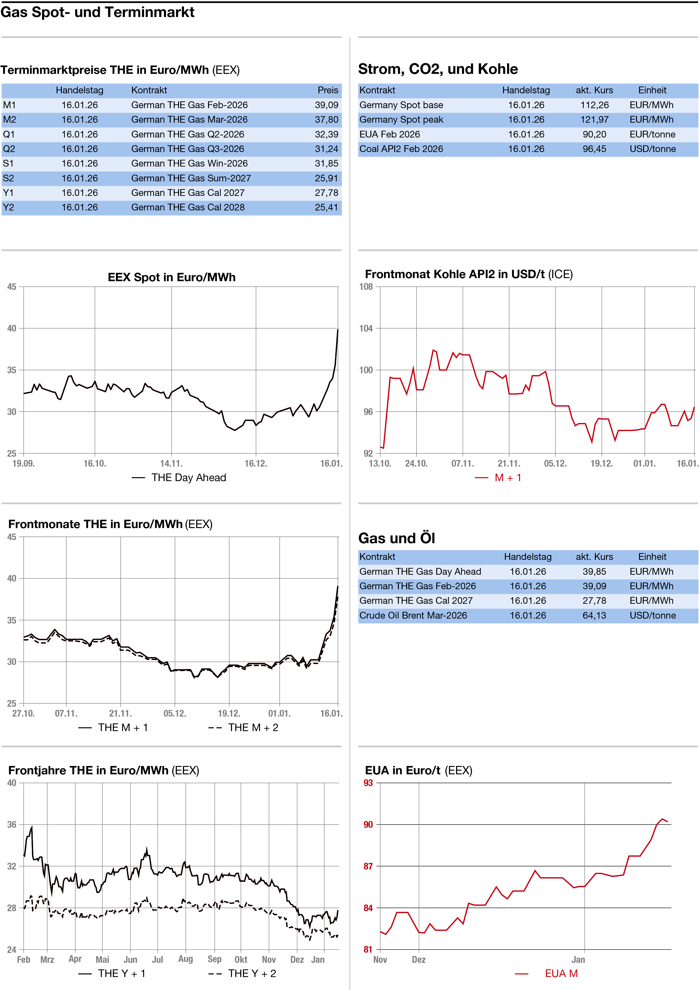 Fester haben sich die Energiemärkte am Freitag gezeigt. Vor allem am Gasmarkt gingen die Notierungen abermals steil nach oben. Der Auslöser dürfte neben der Irankrise, die allerdings langsam abflaut, die neue Kältewelle sein, die Europa in der neuen Woche in den Griff nimmt. Die niedrigen Temperaturen sollen auch in der Folgewoche noch anhalten und laut den Angaben einiger Wetterdienste sogar weiter zurückgehen, was die Sorgen wegen der rasch sich leerenden Gasspeicher in der EU weiter nährt.