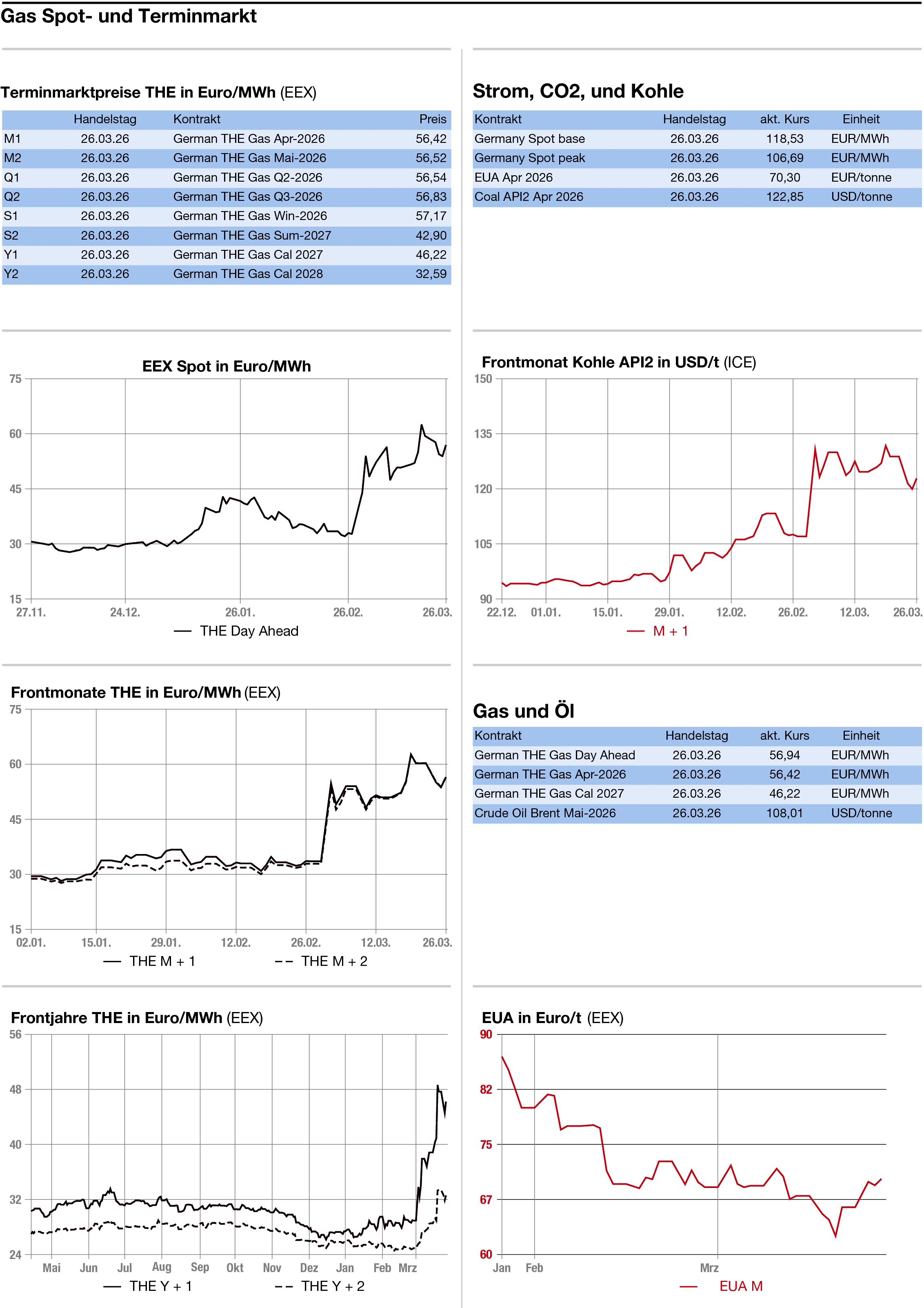 Erdgas: Deutlich erhöht haben sich die Erdgaspreise am Donnerstag. Am TTF gewann der Frontmonat April um 2,550 auf 54,950