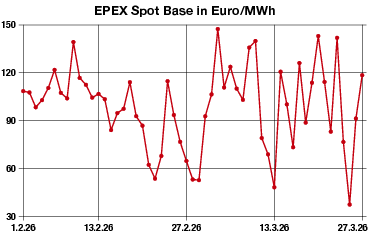 Euro je Megawattstunde im Peak zu. An der Börse kostete der Day-ahead 118,53